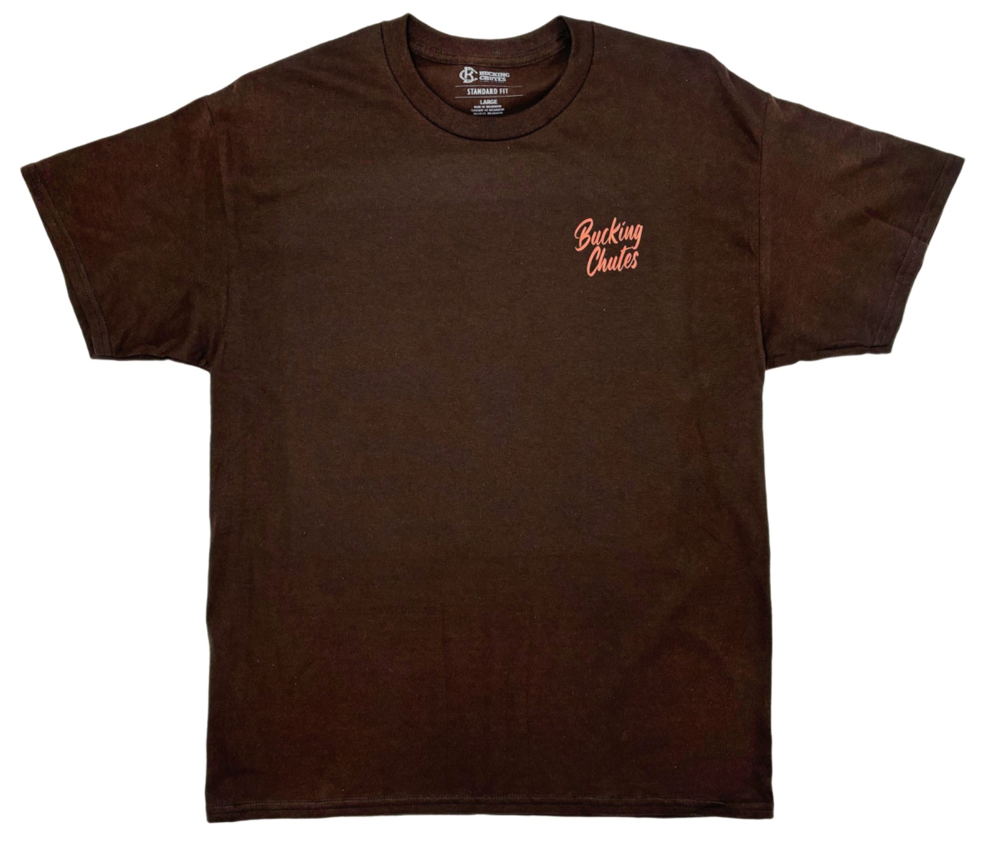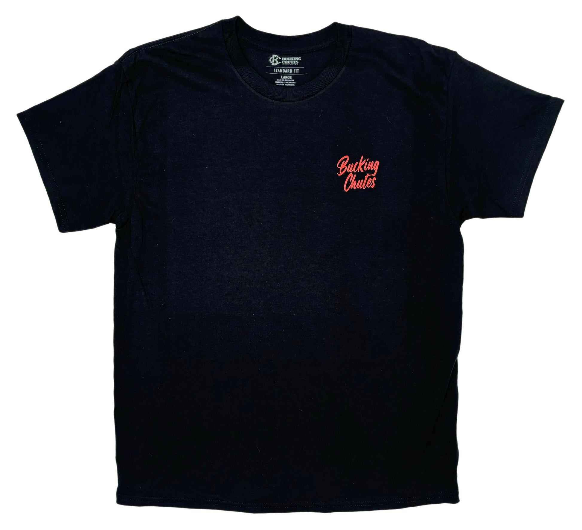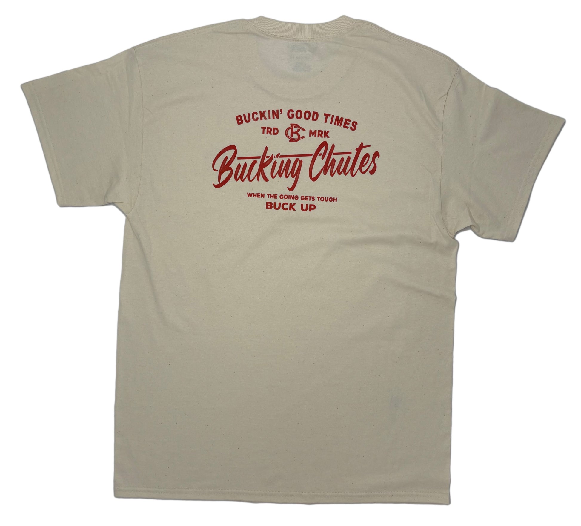 - Large Bucking Chutes in cursive font with "Buckin Good Times", Logo Trade Mark above and caption "When the going gets tough - Buck up" below