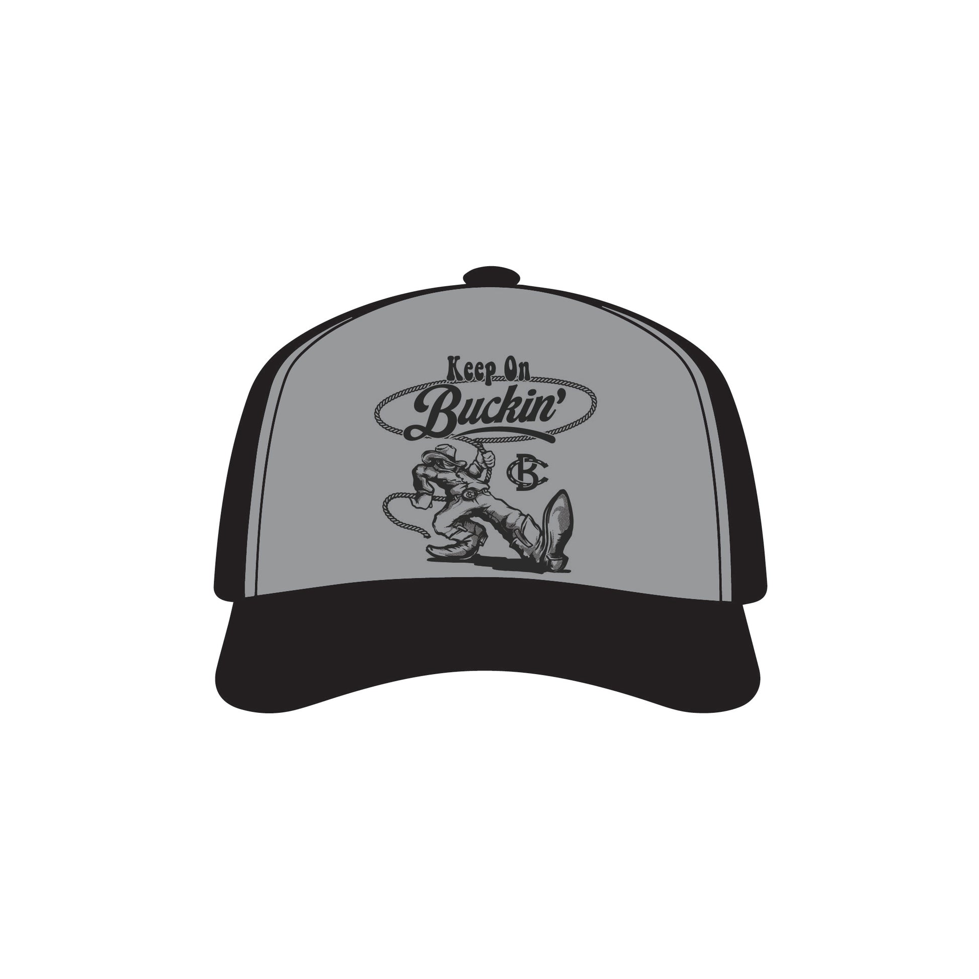 - Cowboy graphic raising lasso overhead with text "keep On Buckin'" and Logo