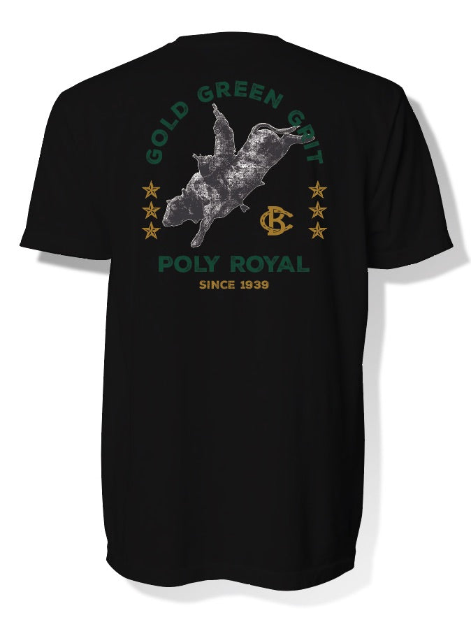- Photo real bull rider with font "Green Gold Grit" & "Poly Royal since 1939" on back with stars